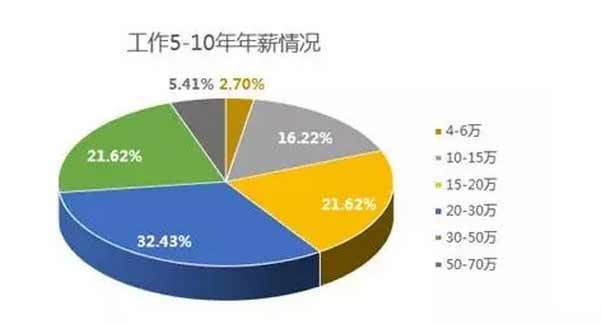 在工作5-10年后,只有2.7%的程序员年收入低于6万。年收入在15-20万的程序员占21.62%,1/3的程序员年收入在20-30万之间,超过1/5的程序员年收入在30-50万之间。年收入在50-70万的程序员占5.41%。