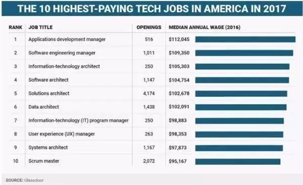 日前,国外招聘网站Glassdoor就选出了IT行业最赚钱的岗位,看起来还是很有参考意义的。最赚钱的当属软件开发经理,其平均年收入为11.2万美元,折合人民币约75万元,而紧随其后的分别是软件技术经理和信息技术架构师,年收入分别是10.9万美元和10.5万美元(折合人民币约70万元)。