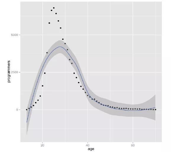 下面我们来看一下他们的年龄分布图:我们可以看到程序员年纪的正态分布(高点在25岁左右,但是中点在29岁左右)