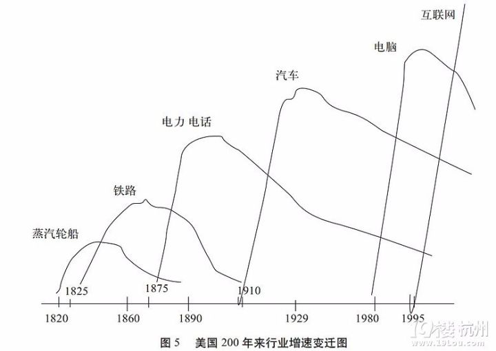 上图,是美国 200 年来行业增速变迁图,描述了从1820年的蒸汽轮船到1995年的互联网在内的,几大行业的变化趋势。国内的行业发展趋势与美国类似,但稍稍滞后几年。每一个行业的增速,均经历了增长、见顶、缓慢下降的阶段。